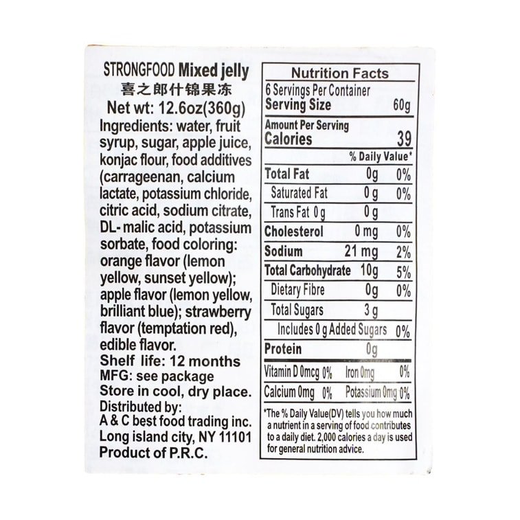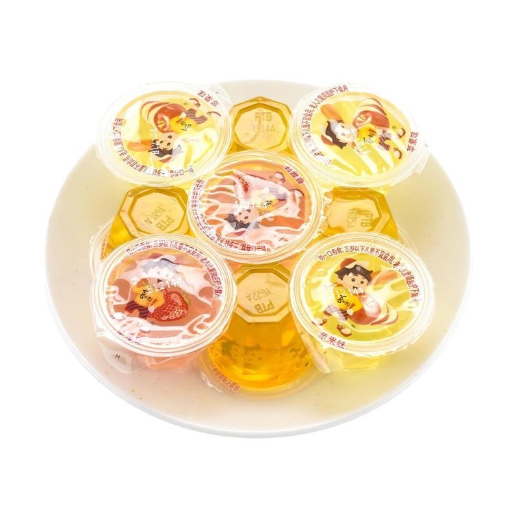 água, xarope de frutose, açúcar branco, suco de maçã, pó de konjac, aditivos alimentares (carragenina, lactato de cálcio, cloreto de potássio, ácido cítrico, citrato de sódio, ácido DL-málico, sorbato de potássio, corante alimentar: sabor laranja (amarelo limão, amarelo pôr do sol); sabor maçã (amarelo limão, azul brilhante); sabor morango (Allure Vermelho), aromatizante alimentar.